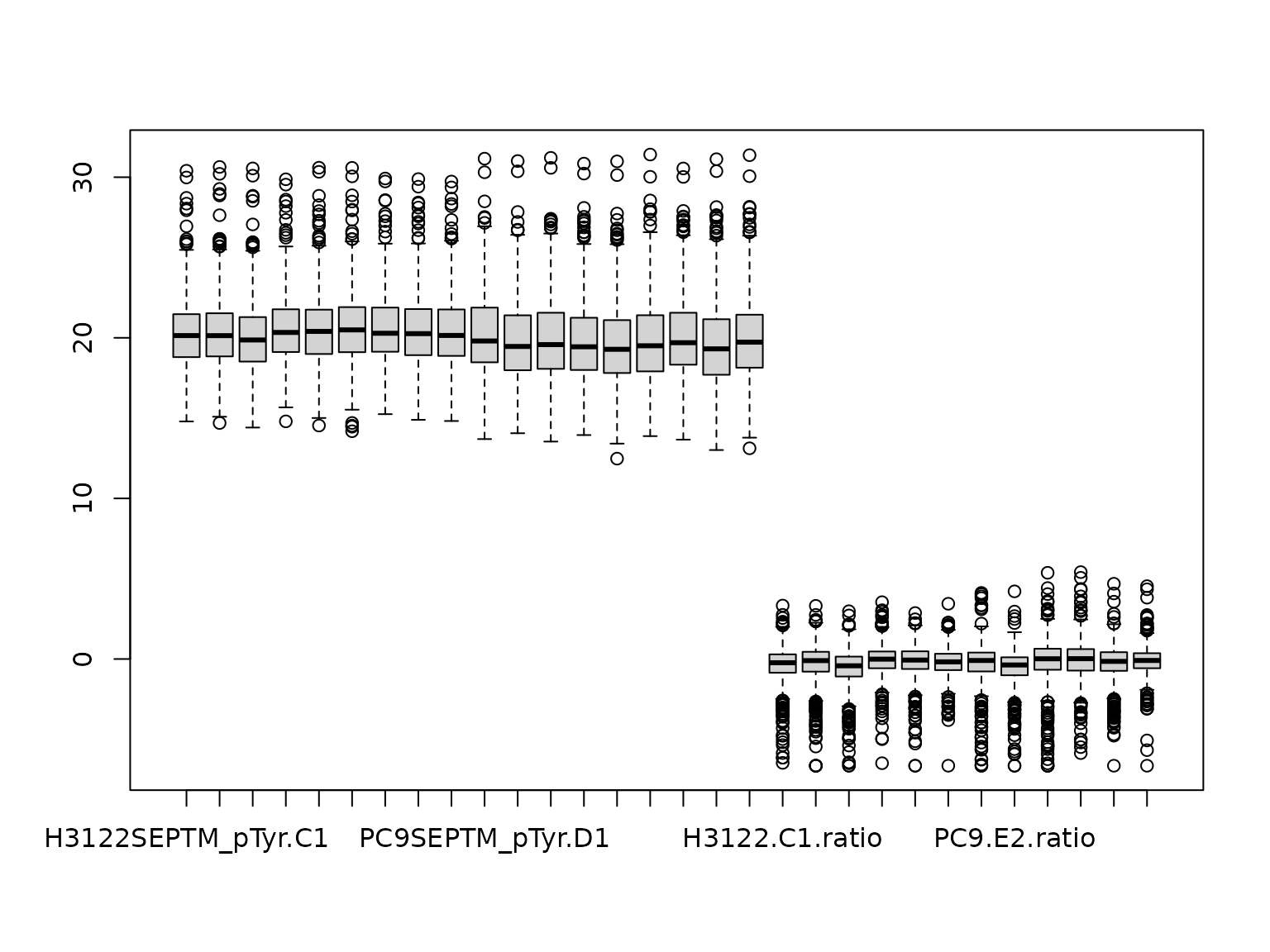 log2ptmdata <- log2(ptmdata)Finally, this dataframe could be used as the example